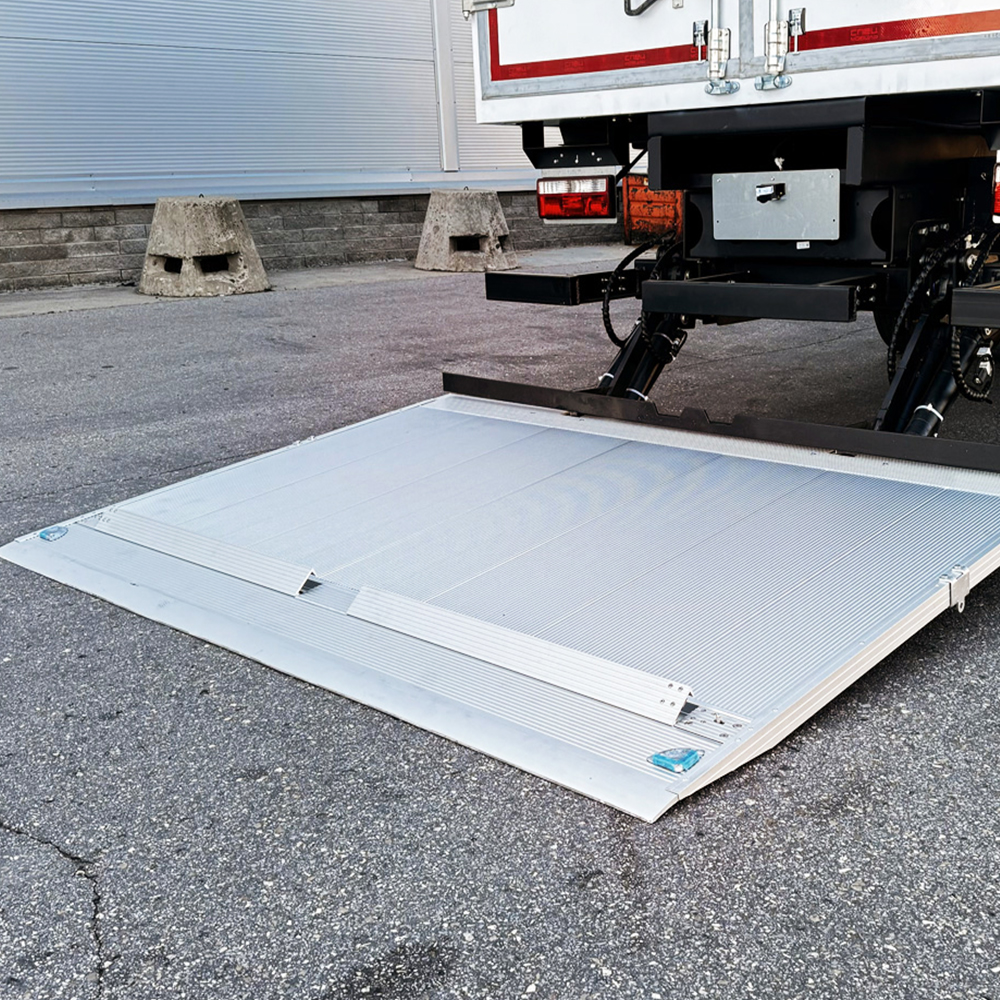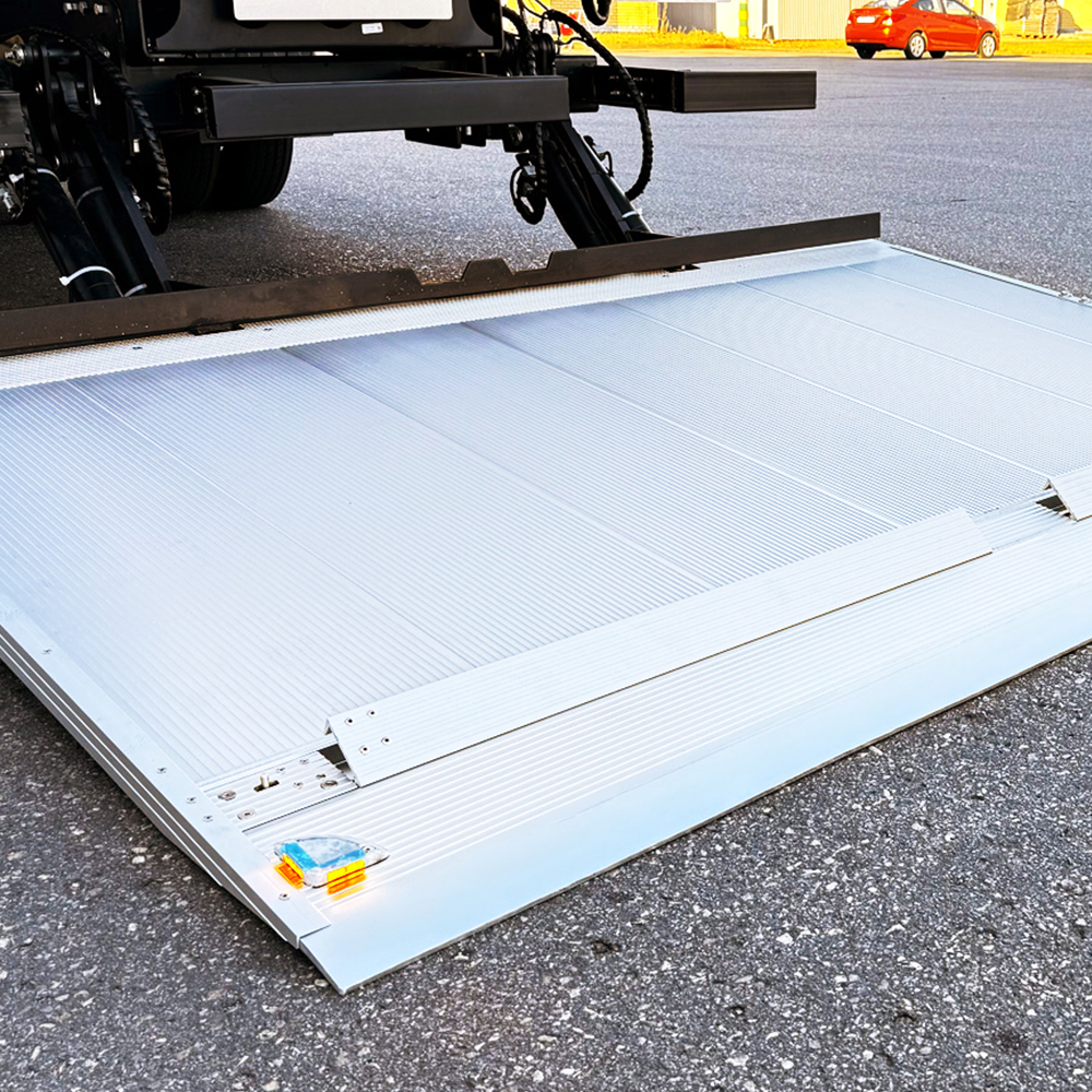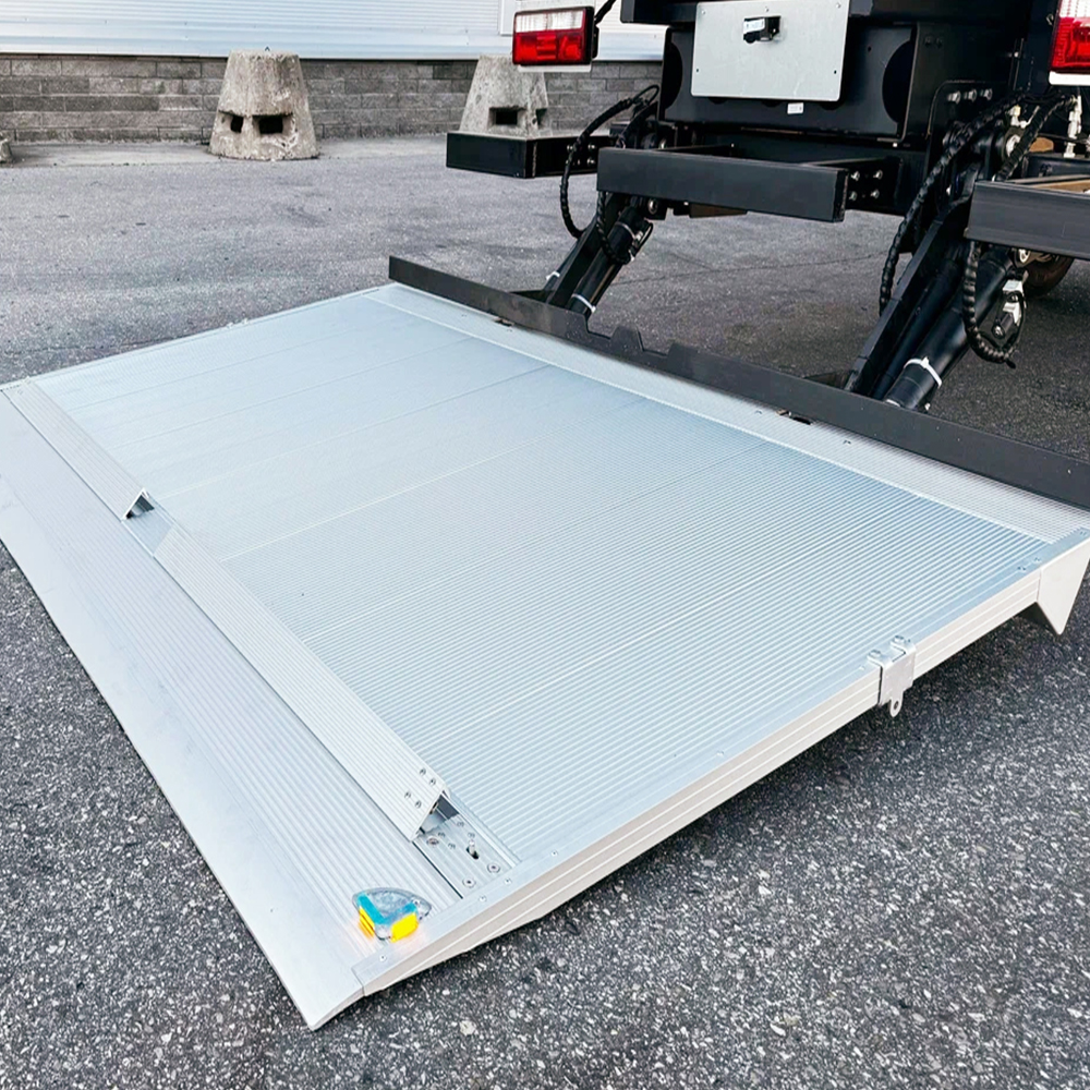 The aluminum platform reduces overall vehicle load while maintaining reliable strength for heavy cargo movement. Its articulated folding sections allow smooth extension and retraction, supporting efficient handling in tight urban environments. This equipment is widely applied in multi-section folding tail lift, lightweight delivery vehicle lift, modular cargo lifting system, and rear mounted folding platform unit, especially for express fleets, retail distribution vehicles, and service transport operations.